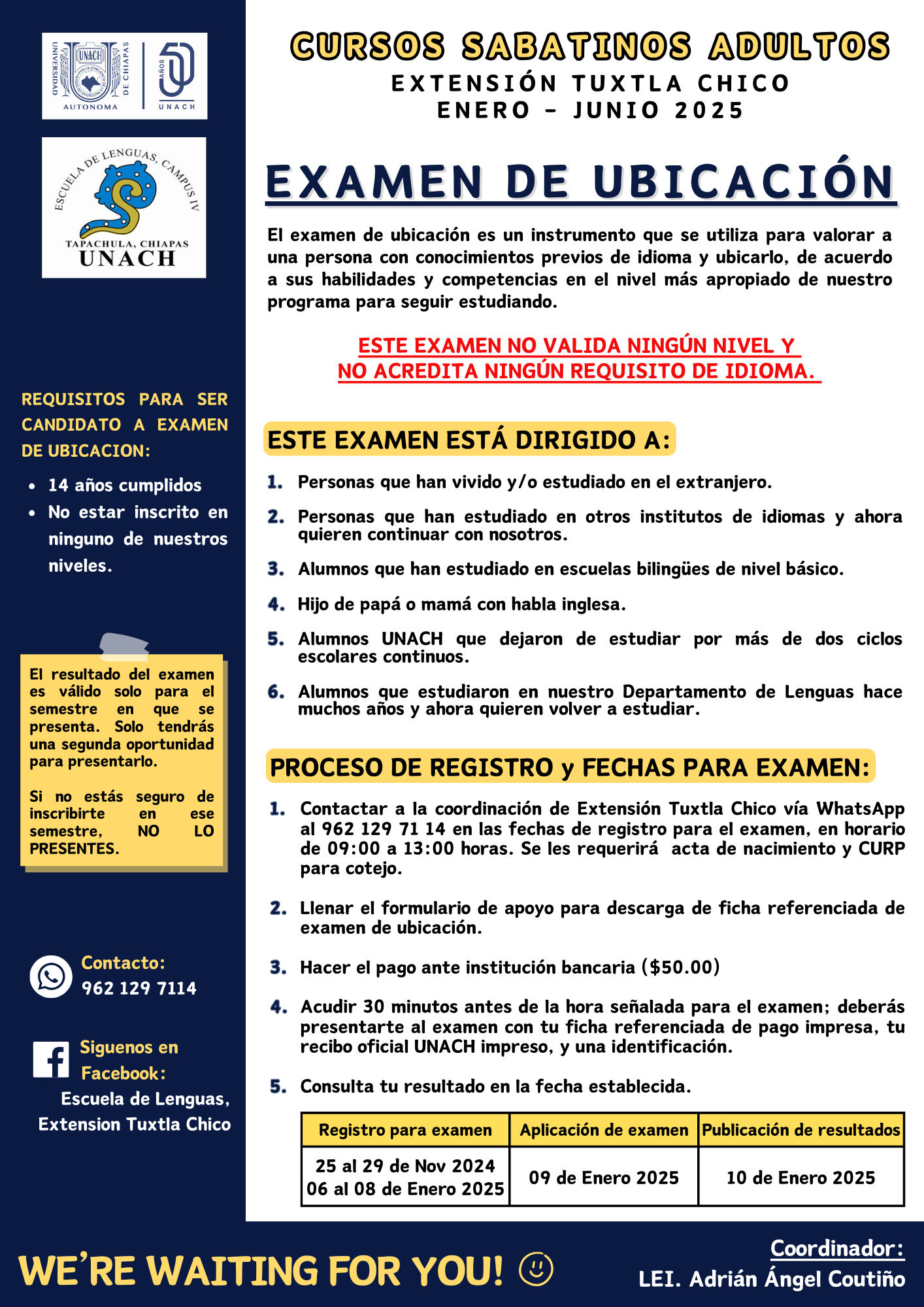 Mtro. DAMIÁN MARTÍNEZ VILLATORO Coordinador del Departamento de Lenguas Teléfono: (961) 61 5 23 96 |